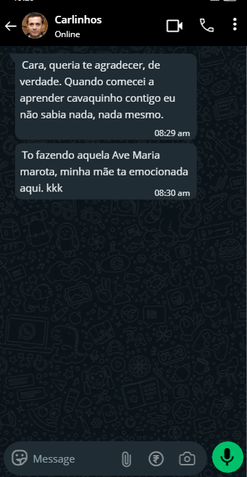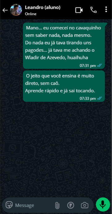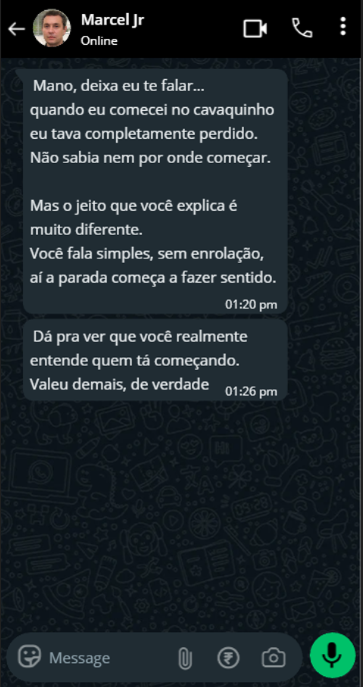 O objetivo desse curso é pegar você pela mão e te ensinar a tocar cavaquinho do zero — mesmo que você nunca tenha encostado no instrumento antes.